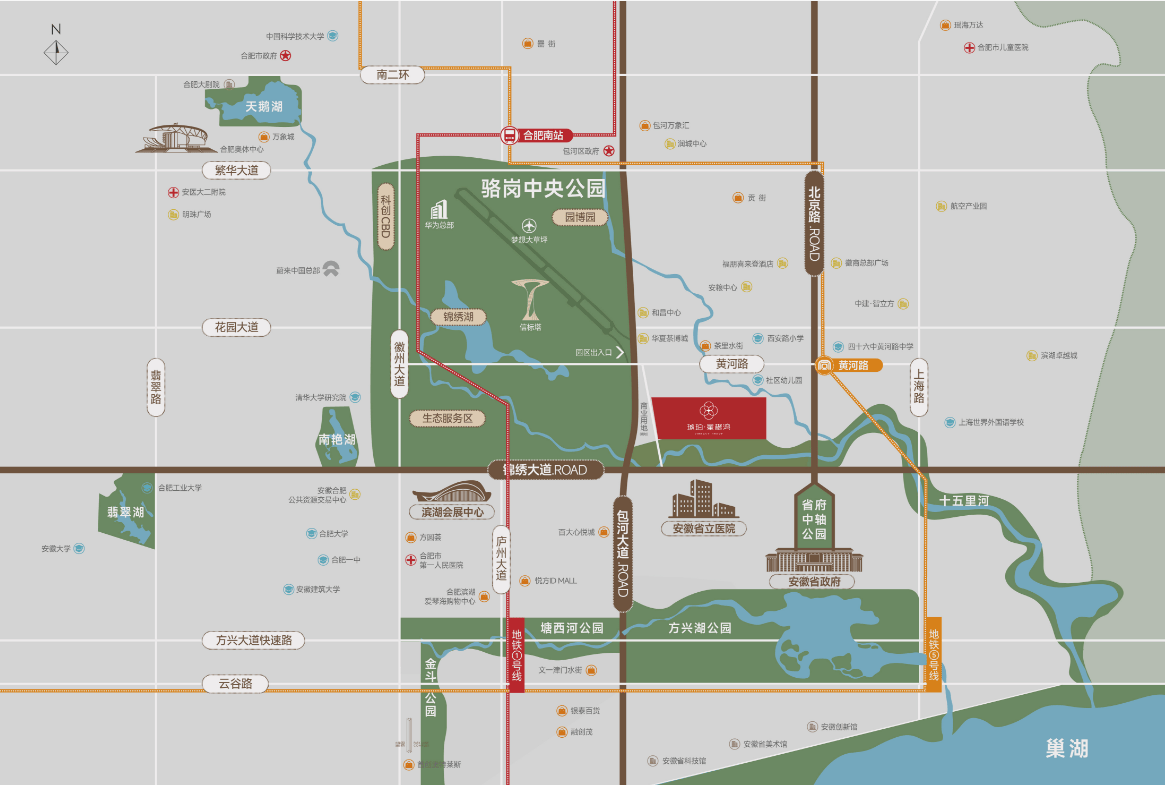医疗与生态配套同样亮眼。医疗方面,项目 2 公里内有包河区人民医院(二级综合医院),日常感冒、发烧、体检均可在此解决;5 公里内有安徽省立医院南区(三级甲等医院),是合肥顶尖的综合医院,可满足大病诊疗需求,为家人健康保驾护航。生态方面,项目西距骆岗中央公园仅 1.5 公里,该公园是亚洲最大的城市中央公园,总面积约 12.7 平方公里,涵盖湿地、花海、运动场馆等,周末带家人散步、野餐、运动都十分惬意;此外,项目北邻十五里河生态公园,沿河岸打造了健身步道,适合晨跑、夜跑,真正实现 “把家安在公园里”。